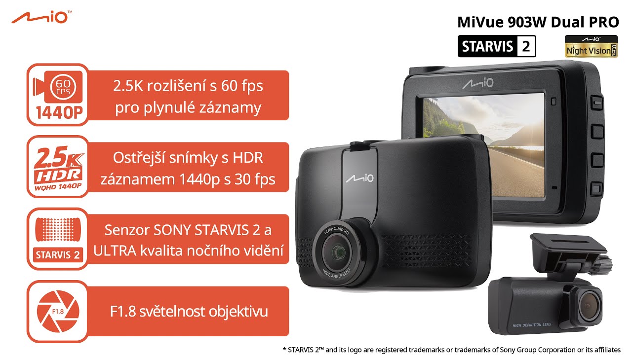 MiVue 903W Dual pro disponuje nejnovějším optickým senzorem STARVIS 2, je to technologie vyvinutá společností Sony, která poskytuje jasnější a ostřejší kvalitu obrazu a barev, zároveň vylepšuje a optimalizuje jas pro záznam v noci, čímž zajišťuje spolehlivější záběry z jízdy.